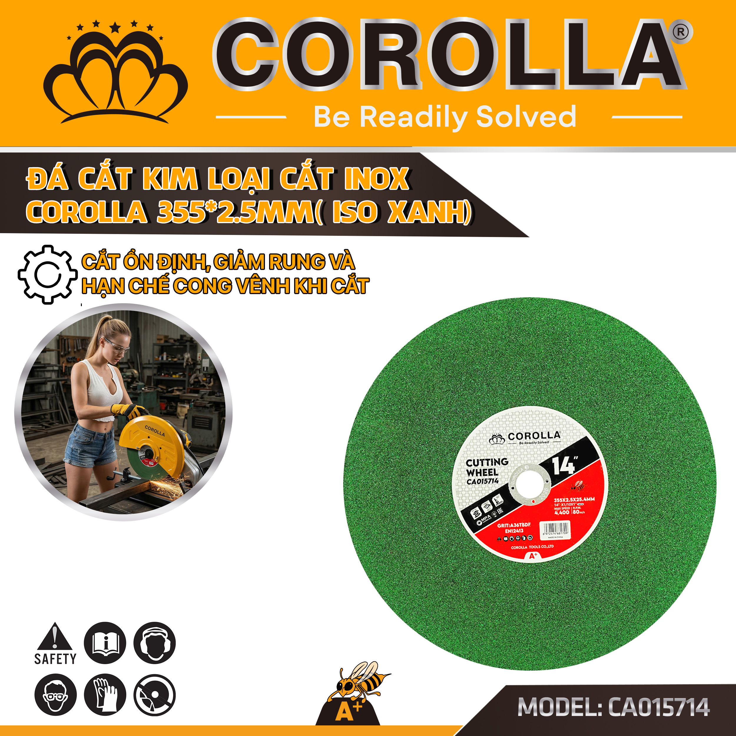 Đá cắt ISO COROLLA phi 355mm chuyên dùng cho máy cắt bàn là một trong những sản phẩm được sử dụng nhiều trong các lĩnh vực xây dựng, cơ khí.