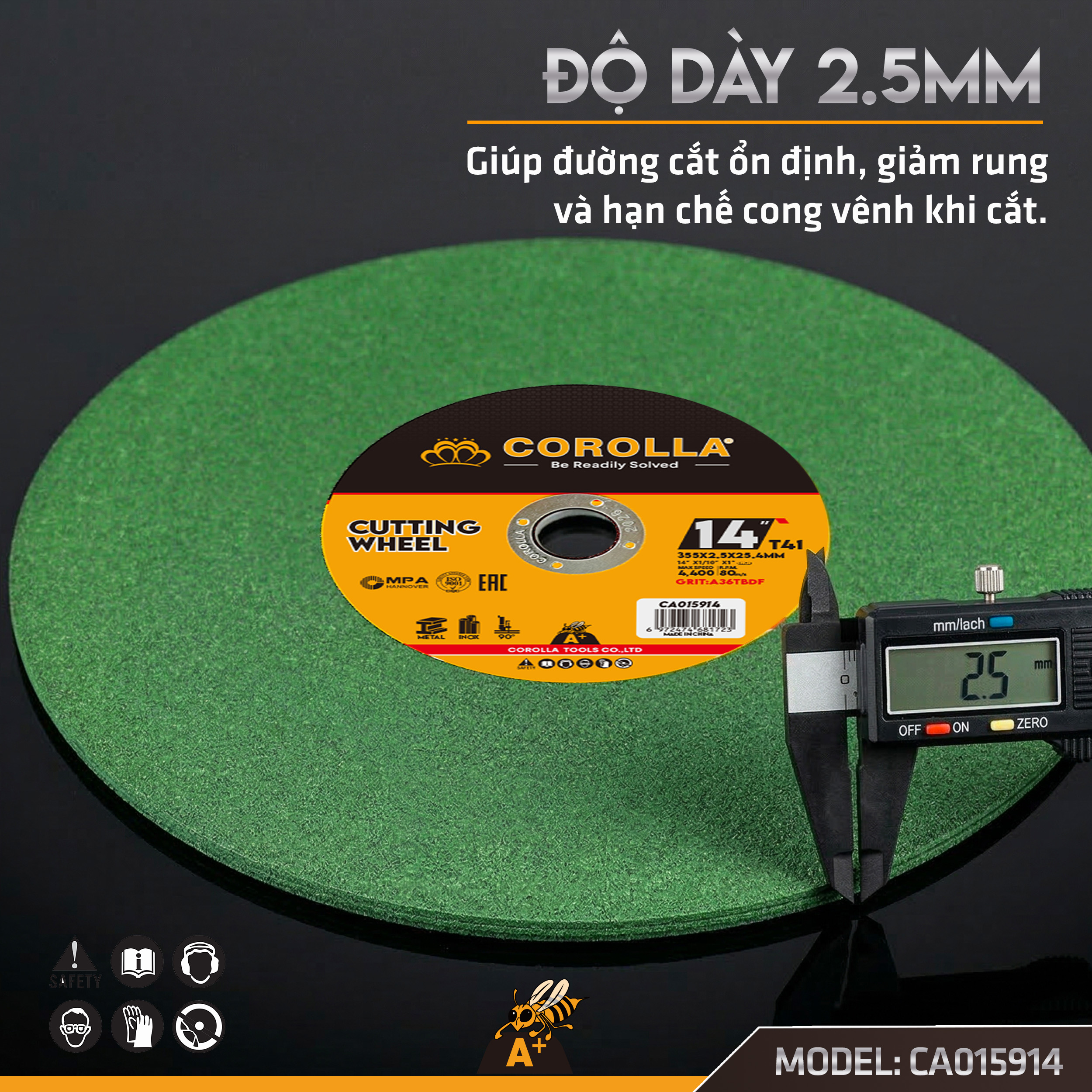Đá cắt 2 màu 14” (355mm) COROLLA được thiết kế chuyên dụng cho cắt kim loại và inox. Sản phẩm sử dụng hạt mài chất lượng cao, cho khả năng cắt nhanh, đường cắt gọn và vận hành ổn định trong điều kiện làm việc liên tục tại xưởng và công trình.