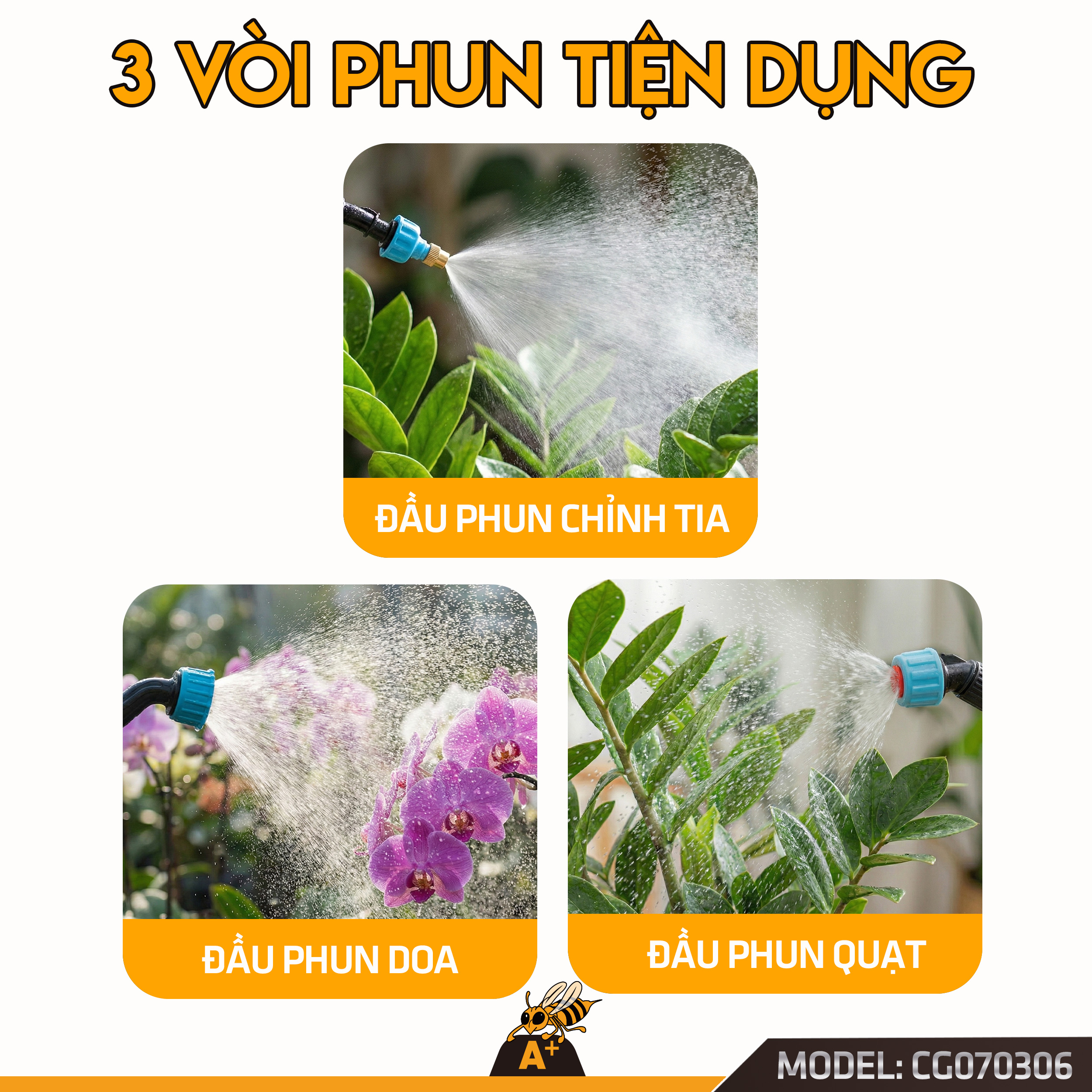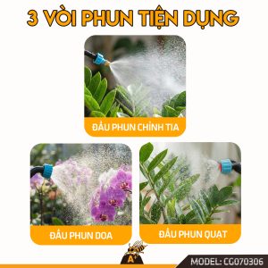 • Đầu phun: 3 loại đầu phun thay thế (phù hợp cho nhiều mục đích tưới từ phun sương đến phun tia).