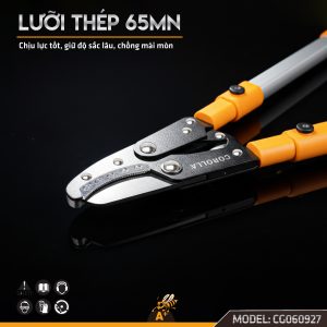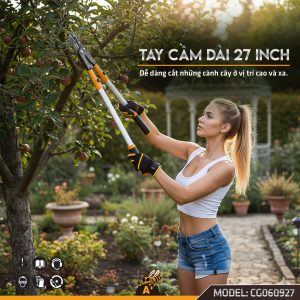 Cán hợp kim cao cấp: Khác với các dòng cán cố định, model CG060927 sở hữu cơ chế chốt khóa thông minh (nút bấm trên khớp nối vàng). Người dùng có thể dễ dàng kéo dài cán để tăng tầm vươn tới các cành cao, hoặc thu ngắn lại để thao tác gọn gàng ở không gian hẹp.