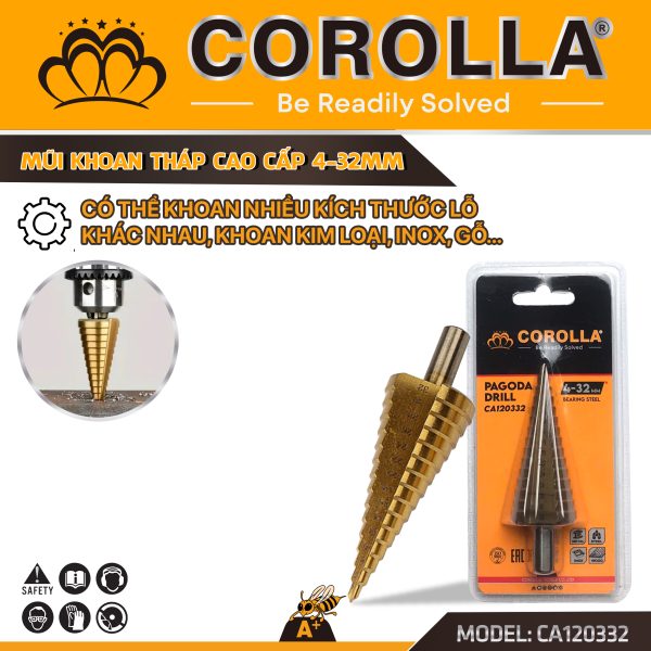 Mũi khoan tháp COROLLA 4-32mm được chế tạo từ thép chất lượng cao, đảm bảo khả năng khoan mạnh mẽ và độ bền vượt trội. Thiết kế dạng tháp đa bậc thông minh cho phép khoan nhiều kích thước chỉ với một mũi khoan, phù hợp cho các ứng dụng cơ khí, lắp đặt và DIY.